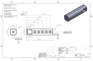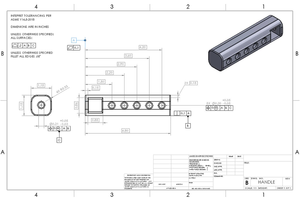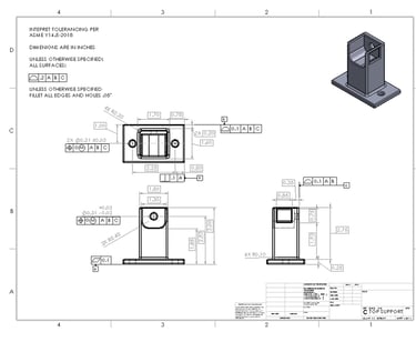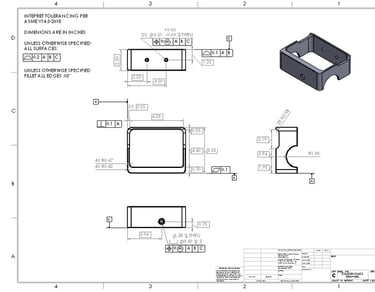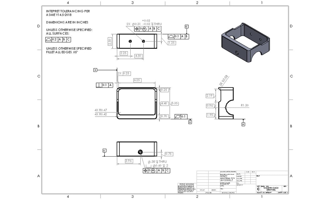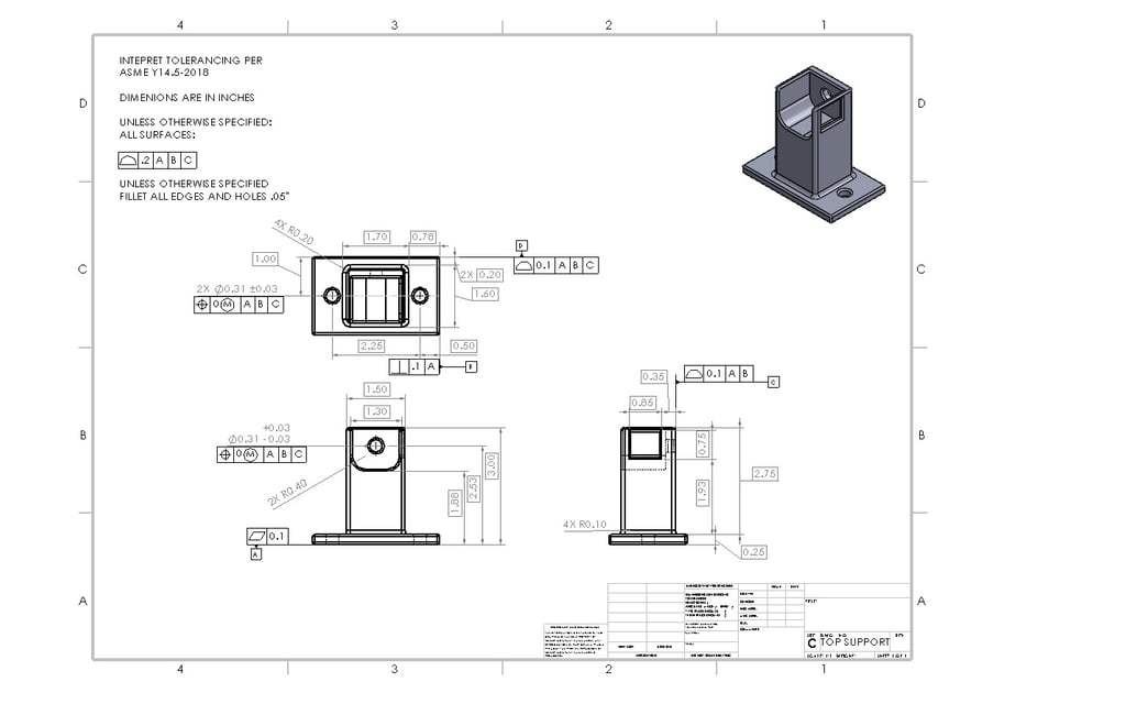 Below you can find the drawings for the three components, all three following ASME Y14.5 for proper GD&T and allow for ease to be manufactured.