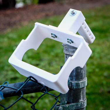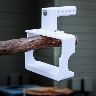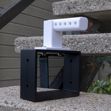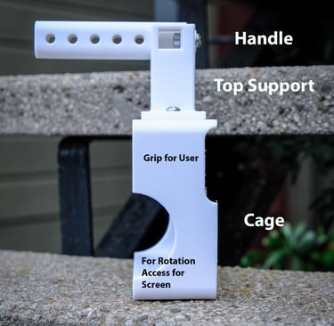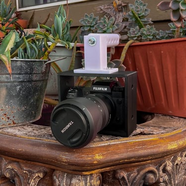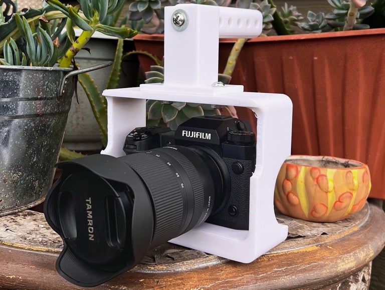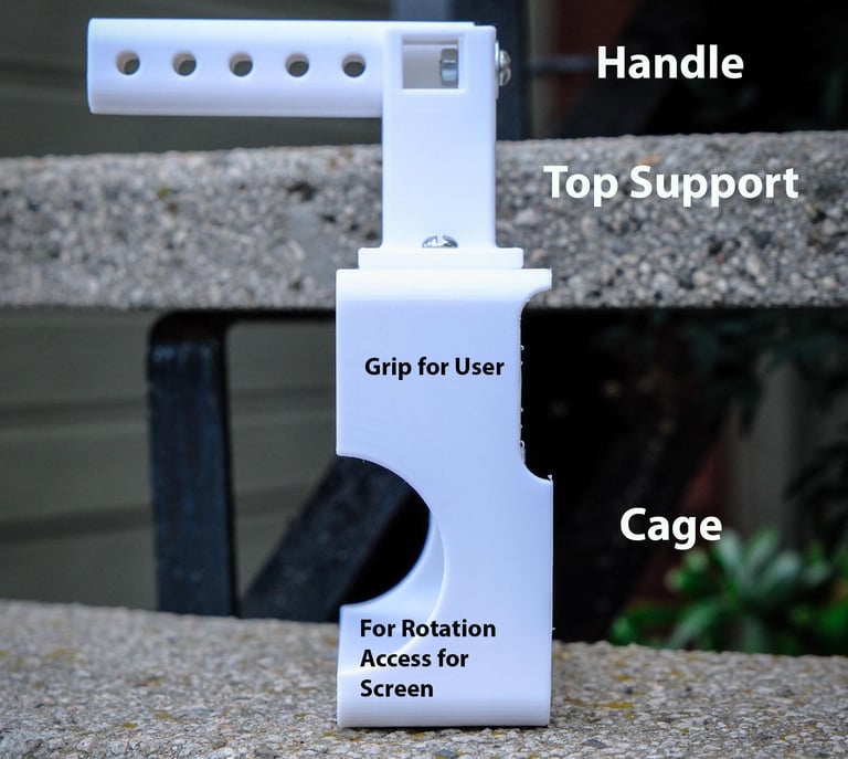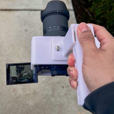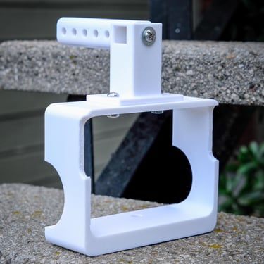 The design consists of three components. The cage, the top support and the handle. They are all being held by 1/4"-20 X 3/4" machine screws and their respective nuts. The camera itself is connected to the cage by a 1/4" threaded hole located at the bottom of the camera.