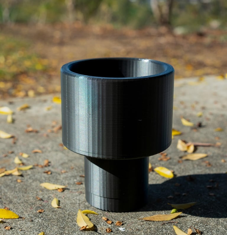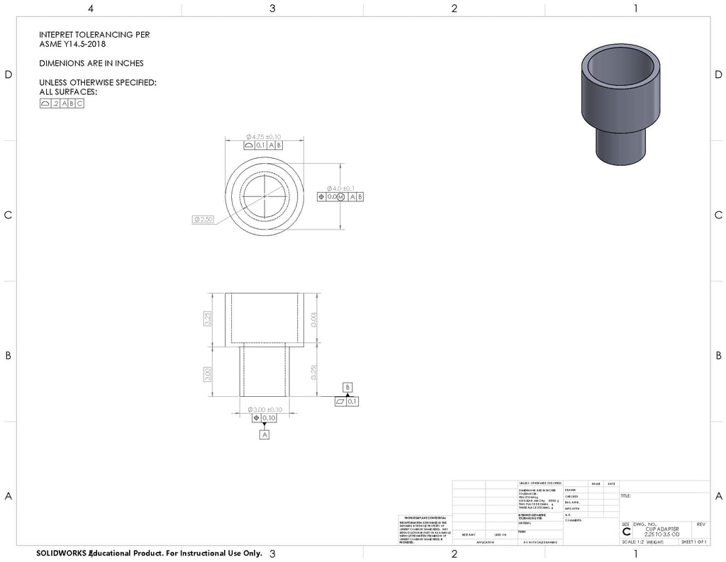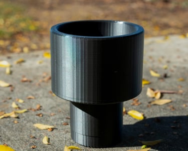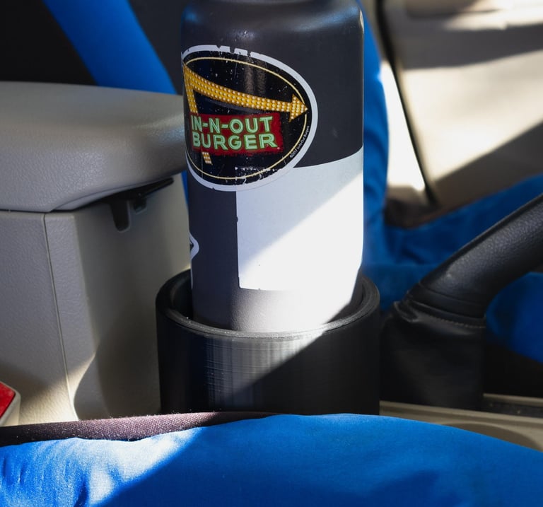 With this project, I wanted to resolve an issue that I was currently facing during my commutes. I have a large 40oz Hydro flask, but have not been able to put it in my car's cupholder. This causes me issues as my bottle is constantly bouncing around my car when I brake or speed up causing damage to the bottle. So, I decided to manufacture an adapter for my Hydro flask. I designed the cup holder in SolidWorks and then I manufactured using a 3-D printer. Images of the Cup holder in my car as well as the drawing can be found below.